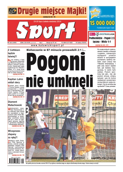 Bielszczanie w 87 minucie prowadzili 2:1 i... Pogoni nie umknęli – po znakomitych mistrzostwach świata w Brazylii i zupełnie... odmiennych występach polskich klubów w europejskich pucharach, byliśmy ciekawi, czym uraczy nas T-Mobile Ekstraklasa i jeśli cały sezon będzie taki, jak bielska inauguracja, to warto było czekać; czy z Celtikiem będzie łatwiej – po raz kolejny o fazę grupową piłkarskiej Ligi Mistrzów będzie polskiemu klubowi bardzo trudno; kapitan Lahm oddał stery – tydzień temu zdobył Puchar Świata, a teraz zrezygnował z dalszej gry w reprezentacji – niemiecki kapitan Phillipp Lahm zrobił to w wieku 30 lat; wiceprezes złapany za rękę – zastępca szefa Związku Piłki Ręcznej w Polsce, członek zarządu Śląskiego Związku Piłki Ręcznej i jednocześnie prezydent Zawiercia, Ryszard M., został zatrzymany z zarzutami korupcyjnymi.