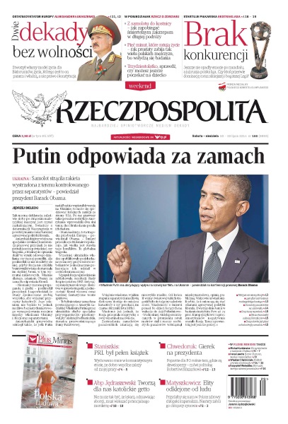Putin odpowiada za zamach – „Samolot strąciła rakieta wystrzelona z terenu kontrolowanego przez separatystów” – powiedział prezydent Barack Obama; dwie dekady bez wolności – ostatni dyktator Europy, Aleksander Łukaszenko, stworzył własny model życia dla Białorusinów, życia, którego jest to on panem i władcą, a nie prawo i konstytucja; brak konkurencji – jeszcze nie opadły emocje po mundialu, a już rusza polska liga. Czy ktoś przerwie dominację coraz silniejszej i bogatszej Legii; elektroniczne oczy i uszy wywiadu – uruchomienie systemu Buk mogły zarejestrować satelity wczesnego ostrzegania oraz samoloty AWACS; minister zostanie bez karty – opozycja domaga się ograniczenia możliwości korzystania przez urzędników z płacenia za pomocą plastiku.