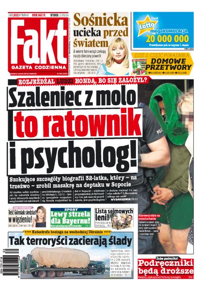 Szaleniec z sopockiego molo to ratownik i psycholog; jak terroryści zacierają ślady po katastrofie boeinga; Sośnicka ucieka przed światem; Lewandowski strzela dla Bayernu; lista sejmowych leni; podręczniki będą droższe; teść Górniak siedział w więzieniu; Kurski znów pędził jak wariat.
