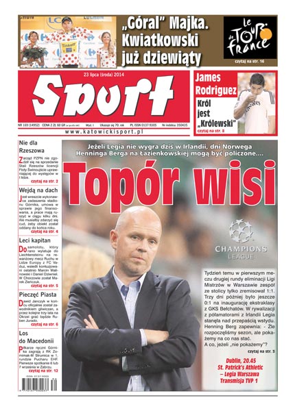Jeśli Legia dziś nie wygra, dni Norwega Henninga Berga na Łazienkowskiej mogą być policzone: Majka najlepszym „góralem”, a Kwiatkowski już dziewiąty; zarząd PZPN nie zgodził się na sprzedanie Stali Rzeszów licencji Floty Świnoujście uprawniającej do występów w I lidze; jest wreszcie wykonawca zadaszenia na stadionie Górnika; Dawid Janczyk w końcu oficjalnie został zawodnikiem Piasta Gliwice, a przez następne trzy lata w drużynie będzie grał Ruben Jurado; w pierwszym występie dla Bayernu Robert Lewandowski strzelił bramkę.