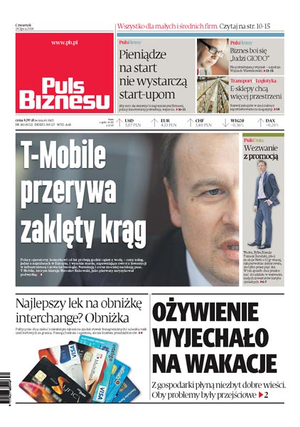 T-Mobile przerywa zaklęty krąg i podnosi ceny; pieniądze na start nie wystarczą start-upom; biznes boi się „ludzi GIODO”; e-sklepy chcą więcej przestrzeni magazynowej; Vectra płaci za akcje Netii o 10 gr więcej, niż pierwotnie deklarowała; najlepszy lek na obniżkę interchange: obniżka; z gospodarki płyną niezbyt dobre wieści – oby problemy były przejściowe.