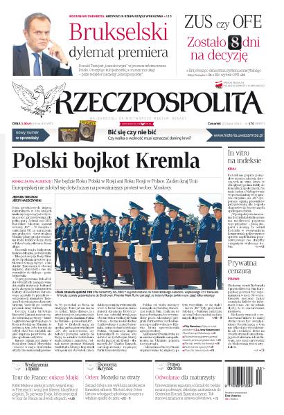 Polski bojkot Kremla: nie będzie Roku Polski w Rosji ani Roku Rosji w Polsce, żaden kraj Unii Europejskiej nie zdobył się dotychczas na poważniejszy protest wobec Moskwy; Donald Tusk jest „hamulcowym” w procesie reformowania Polski, otoczył go kult jednostki, a on sam mu uległ; ZUS czy OFE: na decyzję zostało osiem dni; Kościół nie poprze pomysłów resortu zdrowia dotyczących in vitro, które w ubiegłym tygodniu trafiły do konsultacji społecznych; niedawny wyrok Trybunału Sprawiedliwości Unii Europejskiej pozwoli być zapomnianym w sieci, od wyszukiwarek możemy żądać usunięcia linków do informacji o nas; Tour de France: kolejne zwycięstwo Rafała Majki; Orlen: Możejki na straty; unieważnienie egzaminu dojrzałości będzie można podważyć, składając zastrzeżenia do Centralnej Komisji Egzaminacyjnej; biznesmen: kazali mi sypać Burego; prezes ZUS: żyjemy na kredyt.