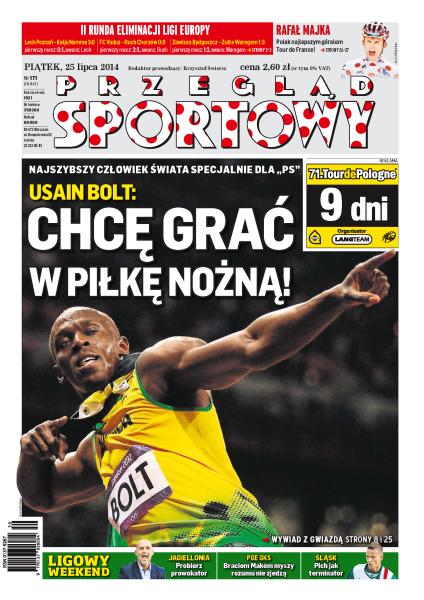 Rafał Majka najlepszym góralem Tour de France; rozmowa z Usainem Boltem: chcę grać w piłkę nożną; II runda eliminacji Ligi Europy: Lech i Ruch przechodzą dalej, Zawisza pożegnał się z rozgrywkami; bracia Makowie: kiedyś się rozdzielimy; rozmowa z Mariuszem Wlazłym, atakującym reprezentacji siatkarzy; Kamil Stoch zajął 48. miejsce w kwalifikacjach do sobotniego Grand Prix w Wiśle.