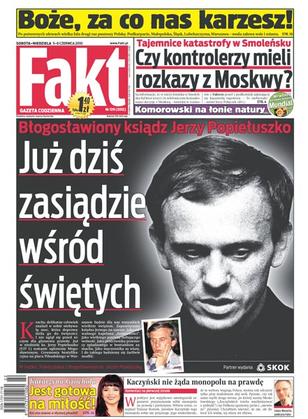Dziś ksiądz Jerzy Popiełuszko zostanie błogosławionym; polscy prokuratorzy potwierdzają ustalenia „Faktu”: w smoleńskiej wieży kontrolnej był ktoś trzeci, prawdopodobnie oficer rosyjskich służb bezpieczeństwa; za 15 lat będziemy przechodzić na emeryturę w wieku 67 lat; wiejskie życie marszałka Komorowskiego; jeszcze na dobre nie opadła woda po pierwszej klęsce, a znów żywioł pustoszy polskie wsie i miasteczka; plaga komarów po powodzi; wybuch gazu zniszczył budynek żłobka w Krakowie; Katarzyna Grochola jest gotowa na nową miłość; Hubert Urbański też stał się ofiarą powodzi; Robert Lewandowski przekonuje, że w meczu z mistrzami Europy nasza kadra ma szanse na wygraną; nasi reprezentanci są pełni optymizmu przed ruszającą właśnie siatkarską Ligą Światową; Jarosław Hampel chce wygrać w Danii; stracony sezon Gortata.