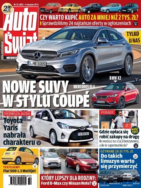 Nowe SUVy w stylu coupé – jeśli forma jest ważniejsza od funkcjonalności, to poprosimy przynajmniej stylowo – w ten trend kompaktowe SUV-y w wersji coupé wpisują się jak ulał, dlatego właśnie druga generacja Mercedesa GLA będzie miała taką odmianę, BMW planuje rodzeństwo dla X2, czyli X1, a Audi na bazie nowego Q3 zbuduje Q1; gdzie opłaca się robić zakupy na drogę – ile wydasz na stacji benzynowej, a ile w supermarkecie; podróż pełna nostalgii – w tym roku Mustangowi stuknęła pięćdziesiątka, ten samochodowy superbohater nie ma jednak choćby pół siwego włosa – jego muskulatura, która tworzy kuszącą sylwetkę, również nie straciła nic ze swej jędrności, sportowe coupé Forda to produkt, który nie ma daty ważności; Ford B-Max czy Nissan Note – szukamy najpraktyczniejszego i najoszczędniejszego auta dla młodej rodziny; roboty testują opony – w centrum rozwojowo-badawczym Continentala pod Hanowerem mieliśmy okazję zwiedzić 300-metrową halę służącą do testowania opon, z bliska poznaliśmy też najnowszą „zieloną” oponę Conti.eContact Hybrid.