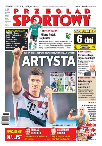 Cudowne gole Lewandowskiego – Niemcy są zachwyceni; Krzysztof Włodarczyk może walczyć we wrześniu z Rosjaninem Grigorijem Grigorijem Drozdem w obronie pasa WBC; Włodarczyk najlepsza na świecie – w Cetniewie Polka rzuciła młotem 78,17 m; rośnie forma piłkarzy Legii przed meczem z Celtikiem – w sobotę pokonali na wyjeździe Cracovię 3:1; były trener polskich siatkarzy Waldemar Wspaniały ostro krytykuje pomysł zakodowania transmisji z mundialu.