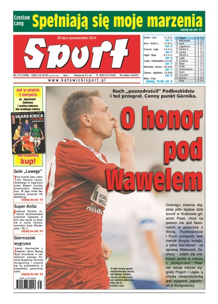 Ruch „pozazdrościł” Podbeskidziu i też przegrał, cenny punkt Górnika; trzy bramki były udziałem Roberta Lewandowskiego w wygranym przez Bayern turnieju towarzyskim Telekom Cup; festiwal Rzutów im. Kamili Skolimowskiej przyniósł najlepszy w tym roku wynik na świecie w rzucie młotem, autorstwa Anity Włodarczyk - 78,17; Jakub Giermaziak z zespołu Verva Racing Team triumfował w niedzielnym wyścigu Porsche Supercup na torze Hungaroring.