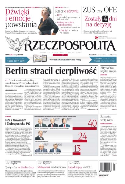 Po zestrzeleniu malezyjskiego samolotu nawet Niemcy chcą ukarać Rosję, to przesądza o stanowisku Unii; PiS z Gowinem i Ziobrą ucieka PO; mnożą się nieudane próby wprowadzenia rozejmu między Izraelem i Hamasem – zginęło 1060 Palestyńczyków i 45 Izraelczyków; sejm obniżył drakońskie kary za przejazd ciężarówek bez opłaty drogami krajowymi; ZUS czy OFE – zostały 4 dni na decyzję.