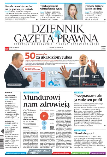 Trybunał Arbitrażowy w Hadze przyznał wczoraj 50,02 mld dol. trzem dawnym akcjonariuszom koncernu Michaiła Chodorkowskiego, skupionym w grupie GML; choć żołnierze, pogranicznicy i policjanci wciąż biorą dużo zwolnień, to ich liczba w końcu spada; kontrolerzy w środkach komunikacji nie mogą stosować przymusu; Kiejkuty nie pomogły Ameryce; różnice między Polską A i B widać także w sferze kultury – potwierdzają to dane GUS.