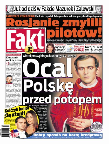 Na tę chwilę wierni musieli czekać aż 26 lat: ks. Jerzy Popiełuszko został ogłoszony błogosławionym; druga fala powodziowa dotyka te same obszary, które nawiedziła podczas kataklizmu w maju; Jerzy Miller uspokaja, ze rząd pomoże wszystkim, którzy nie mogą sami uporać się ze skutkami powodzi; rosyjski kontroler podał polskim pilotom prezydenckiego Tu-154M złe dane; kulisy kampanii wyborczej; jak polscy piłkarze relaksują się podczas pobytu w Hiszpanii.