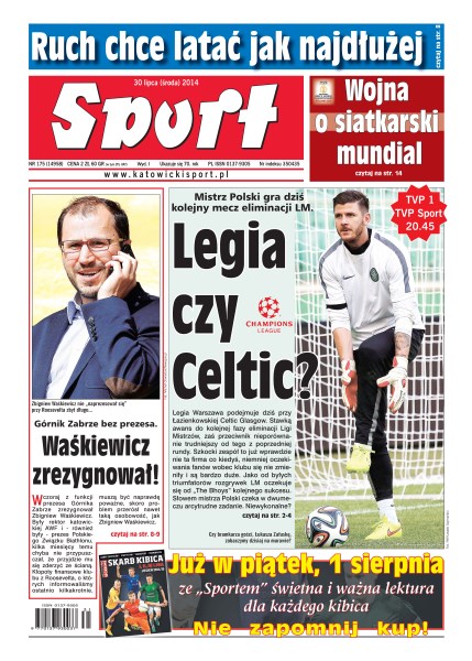 Ruch chce latać jak najdłużej; Legia czy Celtic – mistrz Polski gra dziś kolejny mecz eliminacji LM; Górnik Zabrze bez prezesa – Zbigniew Waśkiewicz nie „naprezesował się” przy Roosevelta zbyt długo...; wojna o siatkarski mundial.