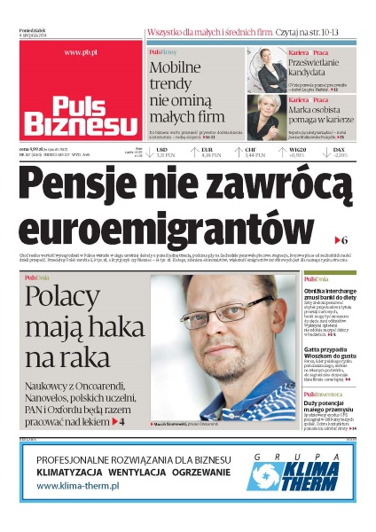 CV nie pozwala poznać pracownika – mówi Lucyna Pleśniar; do biznesu warto przenieść prywatne doświadczenia z internetem – radzą eksperci; choć realna wartość wynagrodzeń w Polsce wzrosła w ciągu ostatniej dekady o ponad jedną trzecią, podczas gdy na Zachodzie panowała płacowa stagnacja, krajowe płace od zachodnich nadal dzieli przepaść; Polacy mają haka na raka – naukowcy z Oncoarendi, Nanovelos, polskich uczelni, PAN i Oxfordu będą razem pracować nad lekiem; żeby zrekompensować ubytek przychodów z tytułu prowizji kartowych, banki mogą być zmuszone do cięcia sieci oddziałów; spodziewany exodus OFE pociągnął w dół kursy małych spółek – dobra koniunktura pomoże im odrobić straty.