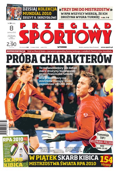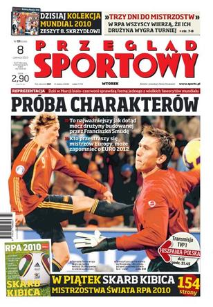 Już dziś biało-czerwoni sprawdzą formę jednego z wielkich faworytów mundialu, czy Polacy są w stanie strzelić bramkę Hiszpanom; wywiad z Tomaszem Kuszczakiem; rozmowa z Waldemarem Sobotą; nasi siatkarze walczą o honor w Lidze Światowej; Boston Celtics wygrali z Los Angeles Lakers 103:94; Anita Włodarczyk największą gwiazdą Memoriału Kusocińskiego; najlepsi skrzydłowi zbliżającego się mundialu w RPA.