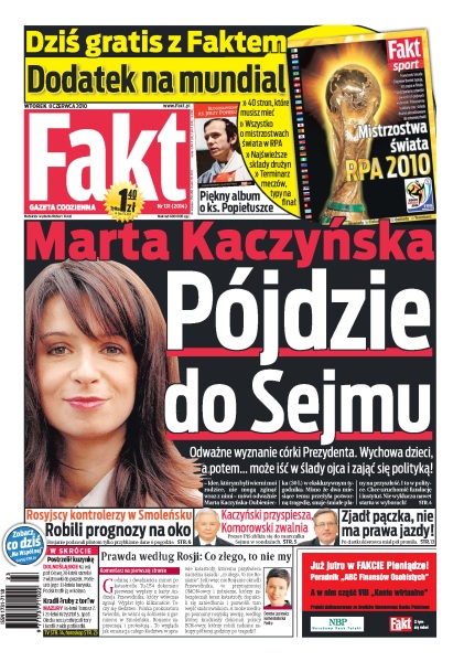 Marta Kaczyńska nie wyklucza startu w wyborach parlamentarnych; Rosjanie podali polskim pilotom rozbitego Tu-154 tylko przybliżone dane o pogodzie; Jarosław Kaczyński dogania w sondażach swojego głównego konkurenta Bronisława Komorowskiego; na Lubelszczyźnie ludzie wygnani przez powódź z domu koczują na wałach; Lech Poznań oferuje Sławomirowi Peszce milion złotych za sezon gry, by pozostał w drużynie.