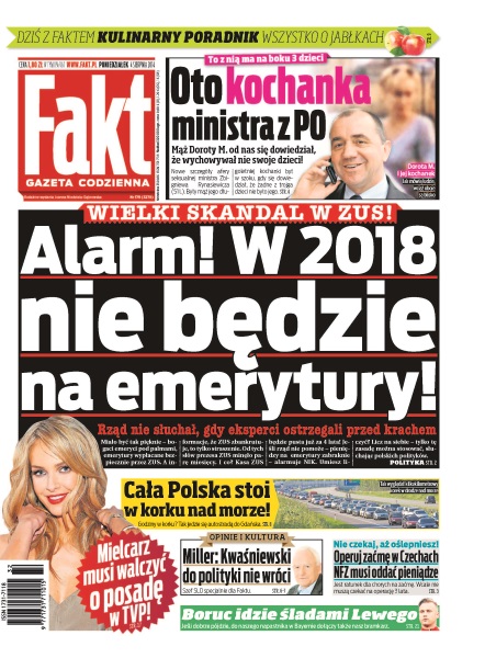 Czy w 2018 roku zabraknie emerytur; kulisy seksafery w rządzie PO; były premier i lider SLD o przyszłości polskiej lewicy i sympatii do premiera Tuska; po obchodach 70. rocznicy powstania; cała Polska wyjechała nad morze; kulinarny poradnik Faktu; jak wieś pomaga bocianom sierotom; największy darmowy koncert w Europie; Czartoryska pogodziła się ze swoją teściową; blondynka z reklamy czy Ligia z „Quo vadis” – jedna z nich poprowadzi popularny show TVP 2; piłkarze Lecha przegrali drugi mecz w przeciągu trzech dni; trener zespołu mistrza Niemiec