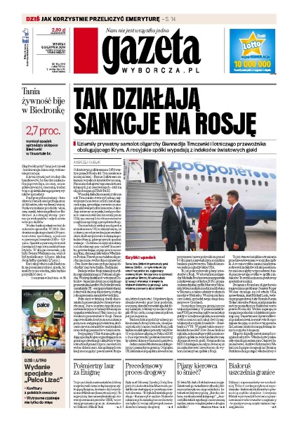 Sankcje uziemiły prywatny samolot oligarchy Giennadija Timczenki i lotniczego przewoźnika obsługującego Krym, a rosyjskie spółki wypadają z indeksów światowych giełd; polscy matematycy, którzy rozpracowali Enigmę, dziś dostaną wyróżnienie Milestone; czy pijany kierowca to śmieć; 1 sierpnia Mińsk wprowadził ograniczenia na wwóz towarów z zagranicy; czy w przyszłości młodzi będą trzymać wszystkie książki na czytnikach, bo nie będzie ich stać na ich przewożenie; dziś Międzynarodowy Dzień Przyjaźni - jest ona nie mniej ważna dla rozwoju naszego gatunku niż miłość; jak mieć wyższą emeryturę; żywność tanieje, a przychody sieci handlowych się kurczą; w Warszawie drugi etap Tour de Pologne wygrał Czech Petr Vakoc; szkocki futbol regularnie obniża swoje loty - w środę może dojść do katastrofy, jeśli Legia wyrzuci Celtic z eliminacji Ligi Mistrzów.