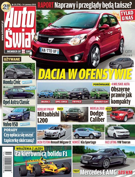 Prezentacja Logana II, limuzyny klasy średniej i hatchbacka z segmentu B; Kia Sportage: pierwsza jazda nowym SUV-em; nowe przepisy regulujące rynek sprzedaży i serwisu samochodów; porównanie małych aut z silnikami benzynowymi; jak zamienić starą skórzaną tapicerkę na nową; co czuje kierowca amator za sterami bolidu Formuły 1.