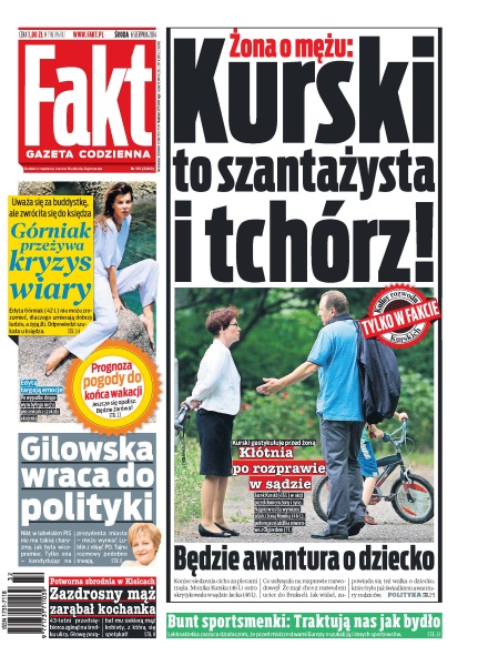 Żona o Kurskim - mój mąż to tchórz i szantażysta; Balcerowicz pływa i trzyma formę; Donald Tusk jest zszokowany podwójnym życiem Zbigniewa Rynasiewicza; czy PiS może wygrać wybory i rządzić sam; czy szaleniec z molo uniknie kary; Edyta Górniak była u księdza w sprawie Darka; może i Ewa Chodakowska nieprawidłowo ćwiczy, a jednak efekty są imponujące; legioniści przylecieli do Szkocji w znakomitych nastrojach - awans do kolejnej rundy jest na wyciągnięcie ręki; Michał Kwiatkowski nie startuje w Tour de Pologne, bo odpoczywa po trudach Tour de France - znalazł jednak chwilę, aby odwiedzić kolegów; prezes PZPS chciałby, żeby mundial był bez dodatkowych opłat; przyszła królowa Wielkiej Brytanii od pierwszej chwili zauroczyła Hollande’a.