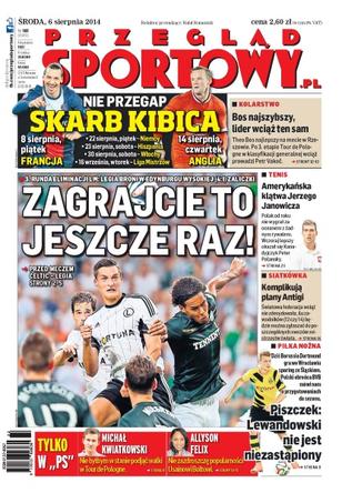 Mistrzowie Polski są spokojni - chcą dziś zepchnąć Celtic w przepaść; 9 lat temu Artmedia wyeliminowała Celtic, choć cudem przetrwała rewanż; dlaczego w środku okna transferowego zmieniono przepisy dotyczące ekwiwalentu za wyszkolenie piłkarzy powyżej 23. roku życia; Zlatan Ibrahimovic zaczął sezon od strzelenia dwóch goli w meczu o Superpuchar, a zaraz potem skrytykował pomysł ściągnięcia Angela Di Marii; Theo Bos najszybszy na mecie w Rzeszowie, ale lider wciąż ten sam; mistrzostwa Europy w Zurychu bez polskiej tyczkarki; czy FIVB zrujnuje szansę gry reprezentacji Polski na dwóch libero; Jerzy Janowicz od roku nie pokonał za oceanem żadnego rywala - w Toronto uległ w I rundzie Kanadyjczykowi Peterowi Polansky’emu.