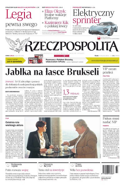 W 2015 roku w sprzedaży pojawią się samochody na prąd, które naładujemy w kilka minut; Legia ma dużą przewagę przed dzisiejszym rewanżem z Celtikiem w eliminacjach do Ligi Mistrzów - niestety, meczu nie obejrzymy w TVP; UE zdecyduje o pomocy dla dotkniętych sankcjami Rosji polskich producentów owoców i warzyw; czy jesienią MON ogłosi przetarg na czarter dwóch samolotów dla polityków; w piątek do kin wchodzi thriller polityczny „Bardzo poszukiwany człowiek” na podstawie powieści Johna Le Carrego; urzędnik nie ma prawa odmówić nadania NIP tylko dlatego, że firma jako adres siedziby wskazała wirtualne biuro - tak uznał wczoraj Naczelny Sąd Administracyjny.