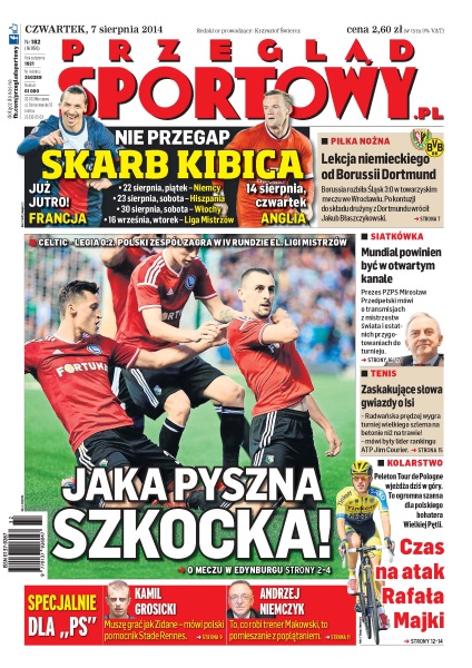 Mistrzowie Polski wygrali drugi raz i jadą dalej; Lech walczy, by uniknąć kompromitacji, jaką byłoby wyeliminowanie ich przez półamatorów; zespół z Dortmundu, nawet bez mistrzów świata, wygrał łatwo - po pół roku leczenia kontuzji zagrał wreszcie Jakub Błaszczykowski; ważą się losy Ikera Casillasa - legenda Realu musi walczyć o miejsce w składzie z Keylorem Navasem i Diego Lopezem; Tour de Pologne wjeżdża w góry - aby myśleć o zwycięstwie, Polak powinien tu nie tylko odrobić straty, ale i zyskać przewagę; jeśli Czech Petr Vakoc wytrzyma tempo w górach, może okazać się zwycięzcą Tour de Pologne; kto wygra bieg na 800 metrów w ME i dlaczego nie będzie to Francuz; zaczynające się 13 sierpnia ME mają być dla Pawła Korzeniowskiego ostatnim ważnym startem na 200 m - o złoto powalczy na torze kolarskim.