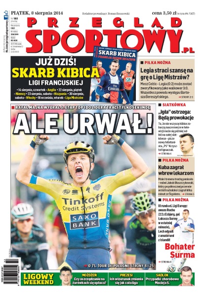 Rafał Majka wygrał 5. etap Tour de Pologne i do lidera traci tylko sekundę; mistrzowi Polski grozi walkower za występ Bartosza Bereszyńskiego - czy warszawianie stracą szanse na Champions League; prezesi klubów zaczynają się sprzeciwiać ślepemu wykonywaniu obowiązków narzucanych przez swoich pracodawców; kto najbardziej zaimponował na półmetku sezonu Formuły 1; Joanna Fiodorow ponownie jest w komitywie z trenerem Czesławem Cybulskim; John McEnroe postuluje, aby z turniejów zniknęli sędziowie liniowi; Billy Baron - jego rodzina pochodzi z okolic Grodna, sam będzie występował w Wilnie, a za rok może stać się jednym z rozgrywających reprezentacji Polski.