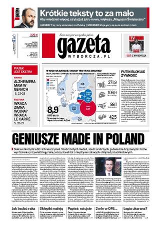 Ministerstwo Zdrowia wydaje rocznie ćwierć miliarda złotych na sprzęt do radioterapii, ale nie sprawdza, czy i jak działa; Moskwa mści się za sankcje; władze Ukrainy, które zrodziły się na Majdanie, próbowały w czwartek Majdan zamknąć; po raz pierwszy w historii w tym roku udział małych, niezależnych sklepów w sprzedaży spadnie poniżej 50 proc. – wynika z badań firmy PMR; gdy Alanna Shaikh ogłosiła, że szykuje się na chorobę Alzheimera, jej głos stał się jednym z najważniejszych w dyskusji o starzeniu się; co się dzieje, gdy zmiksujemy wiedzę barmana z osiągnięciami chemików czy fizyków; po fantastycznym ataku na ostatnim podjeździe Rafał Majka wygrał piąty etap Tour de Pologne z Zakopanego do Szczyrbskiego Jeziora na Słowacji.