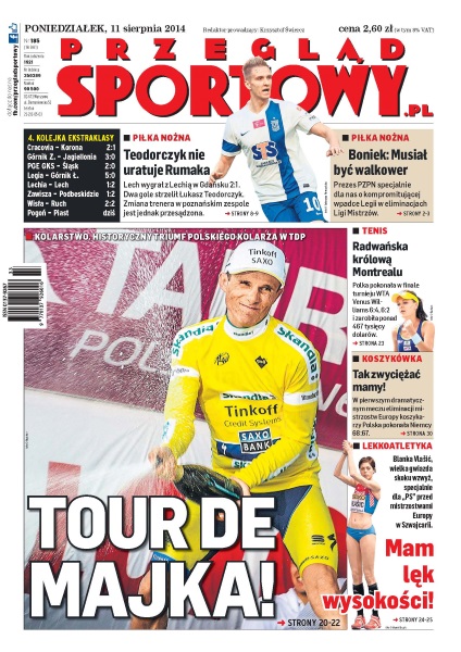 Sześć celnych strzałów, pięć goli – tak skutecznie grali mistrzowie Polski w drugiej połowie meczu z beniaminkiem; zwycięstwo nad Lechią i tak nie uratuje trenera Mariusza Rumaka przed stratą posady; cztery gole, czterech strzelców - wicemistrzowie Anglii bez litości; Rafał Majka jest wielki - w imponującym stylu, jako pierwszy Polak, wygrał wyścig prestiżowego cyklu World Tour; najważniejszy triumf Agnieszki Radwańskiej od 2 lat; w trzecich zawodach indywidualnych mistrzostw Europy w Holsted Tomasz Gollob miał groźny wypadek; w mistrzostwach świata w Moskwie Polacy wywalczyli trzy medale - wszystkie zdobyły panie.