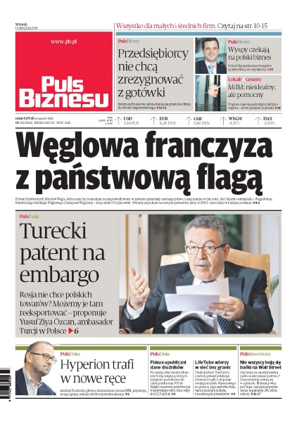 Instytucje finansowe usilnie starają się przekonać firmy do obrotu bezgotówkowego; Patrick Ney przekonuje brytyjskie i polskie firmy do współpracy; pilotaż Państwowych Składów Węgla, które mają być remedium na nieprawidłowości w systemie sprzedaży czarnego paliwa, ruszy jeszcze w tym roku; Rosja nie chce polskich towarów - możemy je tam reeksportować – proponuje Yusuf Ziya Ozcan, ambasador Turcji w Polsce; Andrzej Piechocki, główny akcjonariusz i prezes MNI, przyznaje, że jego grupę czekają wkrótce poważne zmiany; na czarną listę resortu finansów trafią wszyscy, których zaległości podatkowe lub celne przekroczą 500 zł; polski partner YouTube’a i patron gwiazd polskiego internetu myśli o ekspansji swojego modelu biznesowego za granicę.