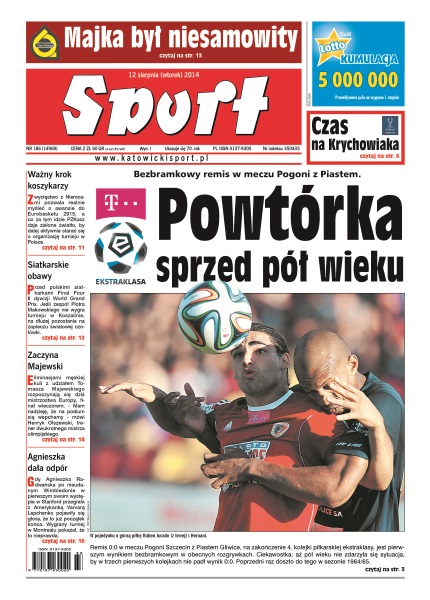 Piast zagrał trochę lepiej niż w poprzednich meczach, lecz wystarczyło to jedynie do zdobycia punktu; w następny weekend Legia raczej nie wygra różnicą pięciu bramek; Grzegorz Krychowiak może dzisiaj zadebiutować w oficjalnym meczu Sevilli i zdobyć pierwsze w karierze trofeum; zwycięstwo nad Niemcami pozwala realnie myśleć o awansie do Eurobasketu 2015, a co za tym idzie PZKosz daje zielone światło, by dalej aktywnie starać się o organizację turnieju w Polsce; eliminacjami męskiej kuli z udziałem Tomasza Majewskiego rozpoczynają się dziś ME, finał wieczorem; Agnieszka bardzo umiejętnie lawiruje między tym czego może uniknąć, a tym co sama może zrobić - mówi Karol Stopa.