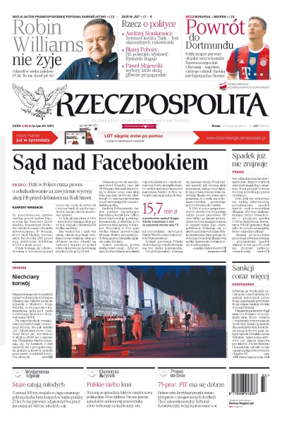 Robin Williams nie żyje; Seremet kontra Tusk – bez aksamitnych rękawiczek; dlaczego PiS powinien wystawić Ryszarda Bugaja; polski snajper pierwszy oficjalny mecz w koszulce Bayernu rozegra dziś z Borussią – zespołem, z którego odszedł; dziś w Polsce rusza proces o odszkodowanie za zawyżenie wyceny akcji FB przed debiutem na Wall Street; nie odziedziczymy już automatycznie długów wartych więcej niż majątek po zmarłym - rząd przyjął bowiem wczoraj nowelizację prawa cywilnego; długa kolumna 280 rosyjskich ciężarówek ruszyła wczoraj na Ukrainę - Rosja twierdzi, że wiozą pomoc humanitarną, jadą pod egidą Czerwonego Krzyża i z obserwatorami OBWE; o niemal 100 tys. zmalała w ciągu ostatniego półrocza liczba bezrobotnych w wieku poniżej 25 lat; wczoraj ze sprzedażą biletów ruszyła nowa polska linia 4You Airlines.
