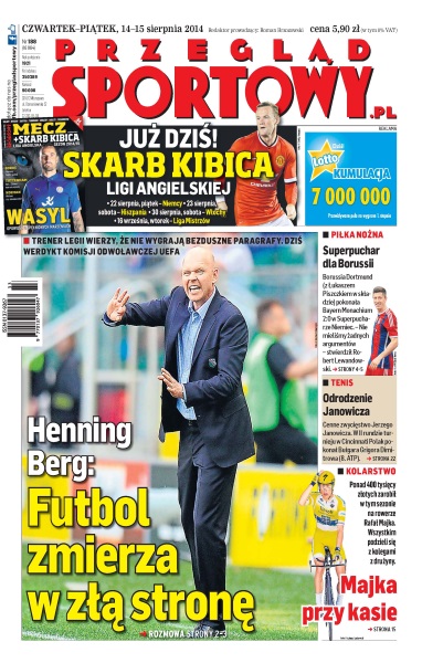 Mistrzowie Polski zrobili wszystko - dziś usłyszą wyrok piłkarskiej centrali; obrońcy Borussii powstrzymali Polaka, a Bayern przegrał walkę o trofeum; działacze Śląska Wrocław mają sposoby, żeby nie płacić ekwiwalentu przy transferach; polski dyskobol na podium - Kszczot, Lewandowski i Kuciapski w finale biegu na 800 metrów; ponad 400 tysięcy złotych wywalczył swoimi wynikami w tym sezonie Rafał Majka - wszystkim podzieli się z drużyną; reprezentacja Polski rozgromiła Luksemburg na wyjeździe; po Agnieszce Radwańskiej sukces w Ameryce odniósł też Jerzy Janowicz; Dawid Kostecki wyszedł wczoraj z więzienia - do ringu może wrócić już w październiku.