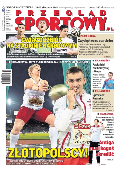 Nokaut Anity Włodarczyk w rzucie młotem, brąz Joanny Fiodorow – Adam Kszczot mistrzem, a Artur Kuciapski wicemistrzem Europy na 800 m; łość na decyzję UEFA odczuwają krajowi rywale zespołu Berga, który bezwzględnie wyładowuje na nich swoją frustrację; Łukasz Fabiański debiutuje w Swansea w meczu z Manchesterem United; Królewscy przyjechali do Warszawy w najmocniejszym składzie – zabrakło tylko Modricia i Isco; Memoriał Wagnera wyłoni czternastkę i podstawowy skład na mundial – Antiga wreszcie musi odkryć wszystkie karty; Polki przegrały z Belgią i straciły szanse na walkę o Final Six; Krzysztof Kasprzak pojechał na Grand Prix do Rygi jako mistrz kraju; Caroline Wozniacki po zaciętym meczu w ćwierćfinale w Cincinnati pokonała Agnieszkę Radwańską.