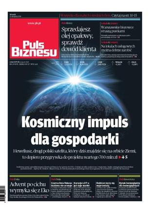 Heweliusz, drugi polski satelita, który dziś znajdzie się na orbicie Ziemi, to dopiero przygrywka do projektu wartego 700 mln zł; sprzedajesz olej opałowy, sprawdź dowód klienta – taką radę ma fiskus dla przedsiębiorców i nie zgadza się na utworzenie rejestru nabywców; warszawskie biurowce straszą pustkami; na lokalach usługowych można dobrze zarobić; Advent po cichu wymyka się z Eko: fundusz wycofuje się z inwestycji w dolnośląską sieć marketów niespełna dwa lata po zwycięstwie w ostrej licytacji; czarna lista fiskusa budżetu nie uratuje; kuracja LOT-u już daje wyniki; Rubicon leczy się wyprzedażą – do końca roku spółka inwestycyjno-doradcza zamierza pozbyć się wszystkich aktywów portfelowych, m.in. Miraculum i 5th Avenue; rynek bezwzględny dla bezwzględnych: fundusze absolute return, do których jeszcze niedawno klienci pchali się drzwiami i oknami, tracą popularność.