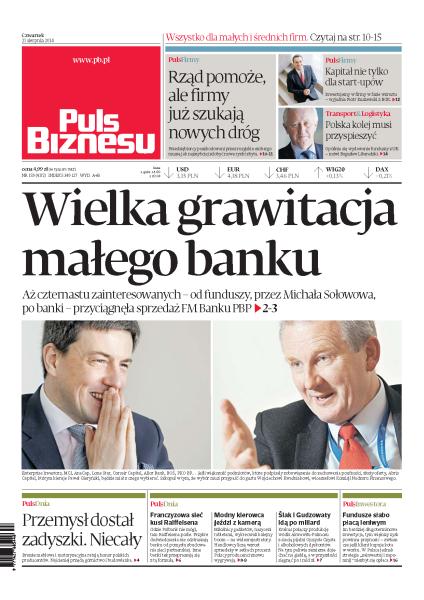 Wielka grawitacja małego banku: aż czternastu zainteresowanych – od funduszy, przez Michała Sołowowa, po banki – przyciągnęła sprzedaż FM Banku PBP; rząd pomoże, ale firmy poszkodowane przez rosyjskie embargo już szukają nowych rynków zbytu; BGK daje kapitał nie tylko dla start-upów; polska kolej musi przyspieszyć – mówi Bogusław Liberadzki; przemysł dostał zadyszki; franczyzowa sieć kusi Raiffeisena; modny kierowca jeździ z kamerą; Krakus połączy produkcję wódki Akwawitu-Polmosu z siecią pijalni Ojczysta Czysta i alkoholowych dyskontów; im bardziej długoterminowa inwestycja, tym większy zysk powinna przynosić — zwłaszcza jeśli klient kupuje kota w worku, w Polsce jednak strategia „zainwestuj i zapomnij” niezbyt się opłaca.