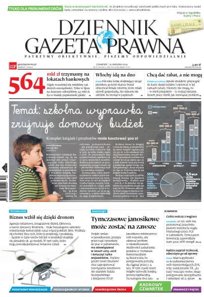 Szkolna wyprawka zrujnuje domowy budżet; 564 mld zł trzymamy na lokatach bankowych; Włochy idą na dno – zapowiadane śmiałe reformy utkwiły w papierach; apteki chciałyby przystąpić do karty dużej rodziny i oferować w jej ramach rabaty, ale nie mogą, bo w myśl przepisów jest to forma reklamy; tymczasowe janosikowe może zostać na zawsze; agencje reklamowe, fotografowie ślubni, filmowcy, a nawet dostawcy internetu – małe bezzałogowe samoloty wykorzystuje komercyjnie coraz więcej polskich firm; Gubin walczy z węglem: 10 tys. osób ma protestować przeciwko planom wydobycia węgla brunatnego przez PGE w Lubuskiem; sędzia zapytał trybunał, odsunięto go od sprawy.
