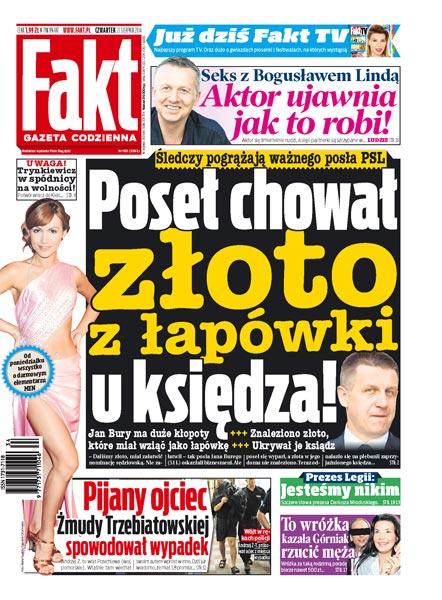 Śledczy pogrążają ważnego posła PSL: Jan Bury chował złoto z łapówki u księdza; Trynkiewicz w spódnicy na wolności; prezes Legii w szczerych słowach o swoim zespole: jesteśmy nikim; seks z Bogusławem Lindą: aktor ujawnia, jak to robi; pijany ojciec Żmudy Trzebiatowskiej spowodował wypadek; to wróżka kazała Górniak rzucić męża.