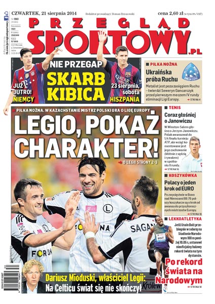 W Kazachstanie Legia zagra o Ligę Europy; Metalist jest poza zasięgiem Ruchu – twierdzi Seweryn Gancarczyk przed pierwszym meczem IV rundy eliminacji Ligi Europy; coraz głośniej o Janowiczu po awansie do 1/4 turnieju w Winston-Salem; polscy koszykarze o jeden krok od EURO po zwycięstwie w Bonn nad Niemcami; jeśli Usain Bolt przebiegnie w sobotę na Stadionie Narodowym 100 m poniżej 10,05 s, ustanowi nieoficjalny halowy rekord świata na tym dystansie; Dariusz Mioduski, właściciel Legii: Na Celticu świat się nie skończył.