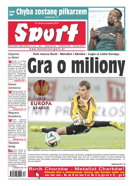 Dziś mecze Ruch - Metalist i Aktobe - Legia w Lidze Europy; Usain Bolt: chyba zostanę piłkarzem; wczoraj na testach medycznych pojawił się w Krakowie Mariusz Stępiński i jeśli przejdzie je pomyślnie, zostanie do końca sezonu wypożyczony z FC Nuernberg; w trzeciej rundzie turnieju ATP World Tour 250 Janowicz pokonał rozstawionego z nr. 12 Francuza Rogera-Vasselina; w czwartym meczu eliminacji mistrzostw Europy koszykarzy Polacy sprawili miłą niespodziankę i wygrali na wyjeździe z Niemcami; na nieco ponad tydzień przed mistrzostwami świata siatkarzy wciąż nie wiemy, jak będzie wyglądał podstawowy skład biało-czerwonych.