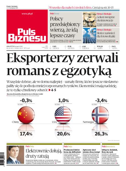Eksporterzy zerwali romans z egzotyką; polscy przedsiębiorcy wierzą, że idą lepsze czasy; program Gekon Narodowego Centrum Badań i Rozwoju wesprze inwestycje; słońce zaświeci dla fotowoltaiki: światowy popyt na panele może stać się szansą dla polskich firm; energetykom fatalnie wiedzie się w wytwarzaniu, dobrze w dystrybucji; ustawa refundacyjna wykreowała zjawisko nieznane na wolnym rynku — reglamentację, a firmy farmaceutyczne, broniąc się przed eksportem tanich leków z Polski, zaczęły ograniczać sprzedaż; niezrzeszonym aptekarzom wiedzie się coraz gorzej, sieciówki tymczasem przestają zaciskać pasa; inwestycję w apartament hotelowy można zaplanować z myślą o udanych wakacjach, ale decydująca jest stopa zwrotu: żeby była wysoka, trzeba wybrać condohotel w atrakcyjnym miejscu.