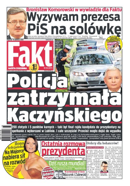 200 złotych i 5 punktów karnych – taki był finał rajdu Jarosława Kaczyńskiego na spotkanie z wyborcami w Lublinie; Bronisław Komorowski wyzywa swojego największego rywala w wyborach na debatę jeden na jednego; już niedługo Polska może zostać gazową potęgą; jak wyglądała ostatnia rozmowa braci Kaczyńskich przed tragicznymi wydarzeniami pod Smoleńskiem; jak wygląda nowy przyjaciel Ilony Felicjańskiej.