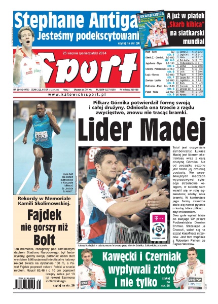 Lider Madej – piłkarz Górnika potwierdził formę swoją i całej drużyny, odniosła ona trzecie z rzędu zwycięstwo, znowu nie tracąc bramki; Kawęcki i Czerniak wypływali złoto i nie tylko; Fajdek nie gorszy niż Bolt – rekordy w Memoriale Kamili Skolimowskiej; falstart Borussii – Niemcy surowo ocenili ligowy debiut Lewandowskiego, a w Dortmundzie chyba już tęsknią za Polakiem; złoto dla Francuzów – ósme miejsce zajęła reprezentacja Polski do lat 18 w mistrzostwach Europy, niektórzy rywale byli dla niej poza zasięgiem.