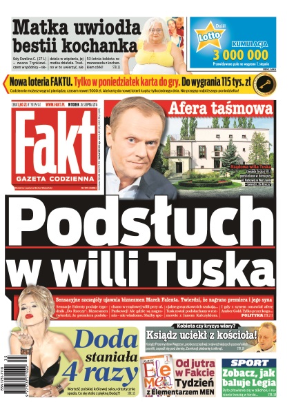 Podsłuch w willi Tuska – sensacyjne szczegóły ujawnia biznesmen Marek Falenta, twierdzi, że nagrano premiera i jego syna; Doda staniała 4 razy – wartość polskiej królowej seksu drastycznie spada, co się stało z piękną Doda; ksiądz uciekł z kościoła – ksiądz Przemysław Węgrzyn, proboszcz jednej z najważniejszych poznańskich parafii, zapadł się pod ziemię, zamknął plebanię i zniknął; zobacz, jak baluje Legia – było pławienie się w alkoholu i nurzanie twarzą w torcie; matka uwiodła bestii kochanka – gdy Ewelina C., zwana Trynkiewiczem w spódnicy, siedziała w więzieniu, jej matka działała – trudno w to uwierzyć, ale 53-letnia kobieta romansowała z kochankiem córki.