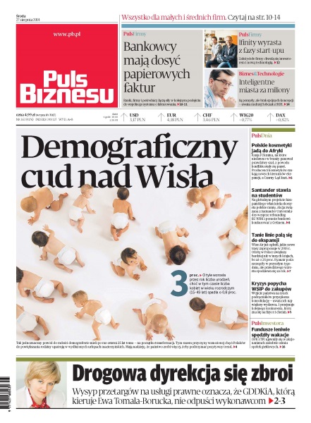 Drogowa dyrekcja się zbroi – wysyp przetargów na usługi prawne oznacza, że GDDKiA, którą kieruje Ewa Tomala-Borucka, nie odpuści wykonawcom; demograficzny cud nad Wisłą – o 3 procent wzrosła przez rok liczba urodzeń, choć w tym czasie liczba kobiet w wieku rozrodczym spadła o 0,8 procenta; bankowcy mają dosyć papierowych faktur – banki, firmy i pośrednicy łączą siły w kolejnym podejściu do wspólnego systemu e-fakturowania; Ifinity wyrasta z fazy start-upu – założyciele firmy chwalą się inwestorem i nową technologią; fundusze leniwie spędziły wakacje – OFE i TFI ujawniły się w akcjonariatach zaledwie ośmiu spółek giełdowych.