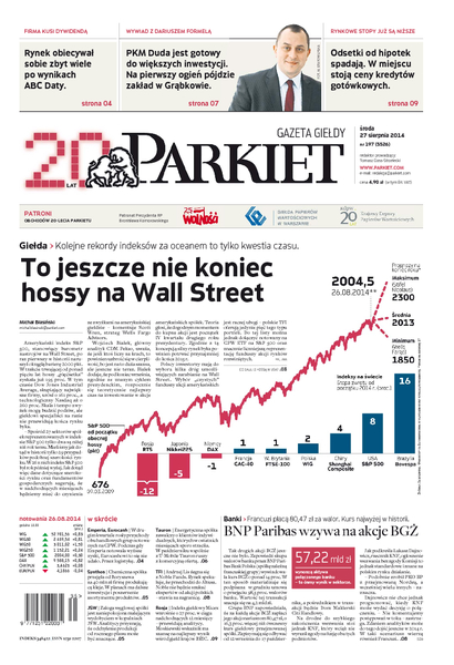 Największy w Polsce newsroom gospodarczy zbiera, analizuje i zgłębia dla Państwa najważniejsze informacje ze świata finansów. Codzienne wydanie „Parkietu”, sześć dni w tygodniu, to kilkadziesiąt artykułów o emitentach, instytucjach finansowych, gospodarce. To również opinie, felietony i wywiady z najważniejszymi ludźmi krajowej i globalnej finansjery.