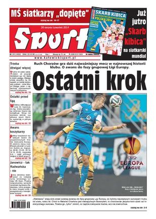 Ostatni krok – Ruch Chorzów gra dziś najważniejszy mecz w najnowszej historii klubu, o awans do fazy grupowej Ligi Europy; ostatki przed ligą – w Zabrzu odliczają już czas do rozpoczęcia ligi, której początkowy terminarz mocno się komplikuje; awans koszykarzy – polscy koszykarze wywalczyli awans do przyszłorocznych finałów mistrzostw Europy; Janowicz tak, Radwańska nie – Jerzy Janowicz awansował do kolejnej rundy tenisowego turnieju US Open, przykrą niespodziankę sprawiła natomiast Agnieszka Radwańska, która przegrała mecz drugiej rundy i pożegnała się z nowojorskimi kortami.