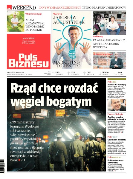 Premier Donald Tusk jest o krok od objęcia stanowiska przewodniczącego Rady Europejskiej, a wpływowi politycy namawiają go, by tekę szefa rządu i stery PO przekazał byłemu wicepremierowi i marszałkowi Sejmu; Carlsberg szuka milionów w butelce; Brak popytu, ograniczenia w sprzedaży produktów za granicą, wysokie koszty i ryzyko walutowe – to, zdaniem przedsiębiorców, bariery dla ekspansji; na zaostrzeniu konfliktu na Wschodzie ucierpieli inwestorzy z warszawskiej giełdy i zadłużeni w obcych walutach; 699 mln zł straty Kompanii Węglowej robi wrażenie, więc rozwiązanie problemów polskiego górnictwa też musi mieć rozmach – w ogniu rewolucji znajdzie się energetyka, a nawet bank.