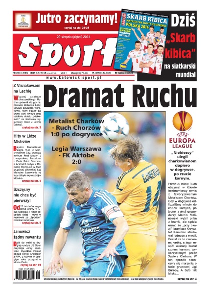 Dramat Ruchu – „Niebiescy” ulegli charkowianom dopiero w dogrywce, po rzucie karnym; z Visnakovsem na Lechię – wczoraj działacze chorzowskiego Ruchu uprawnili do gry napastnika Widzewa Łódź, Łotysza Eduardsa Visnakovsa, który będzie już brany pod uwagę przy ustalaniu składu „Niebieskich” na niedzielny, wyjazdowy mecz z Lechią Gdańsk; hity w Lidze Mistrzów – Bayern Monachium zagra m.in. z Manchesterem City, broniący trofeum Real Madryt z Liverpoolem, Barcelona z Paris Saint Germain, a Arsenal Londyn z Borussią Dortmund w fazie grupowej piłkarskiej Ligi Mistrzów; Szczęsny nie chce być pierwszy – „Od 17 sezonów regularnie gramy w Lidze Mistrzów. I niech tak będzie dalej”.