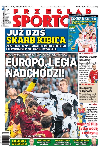 Europo, Legia nadchodzi – 2:0 z Aktobe i Legia Warszawa zagra w fazie grupowej; kadra testowała Narodowy – Zagumny, Wlazły, Kłos, Nowakowski, Winiarski, Mika i Zatorski – w takim składzie trenowała kadra na Stadionie Narodowym, czy to jest skład na Serbię; Ruch poległ w dogrywce – w rewanżu IV rundy eliminacji Ligi Europy Ruch Chorzów przegrał w Kijowie z Metalistem Charków 0:1; doping, „Doping? Piję tylko wodę z cytryną” – Krzysztof Kasprzak, zwycięzca dwóch turniejów Grand Prix opowiada o szansach na medal MŚ, pechu rywali i niedozwolonym wspomaganiu.