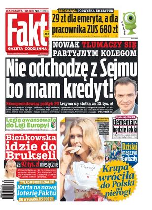 „Nie odchodzę z Sejmu bo mam kredyt” – Nowak tłumaczy się partyjnym kolegom; Legia awansowała do Ligi Europy – Mistrz Polski bez problemu pokonał w rewanżu Aktobe 2:0; Bieńkowska idzie do Brukseli za 92 tysiące złotych miesięcznie; Joanna Krupa wróciła do Polski na pierogi – nie może się powstrzymać, tak uwielbia polskie pierogi, że w Warszawie pożera je prosto z pudełka; elementarz będzie lekki – podręcznik ma 4 osobne części, by nie obciążać małych dzieci; 29 zł dla emeryta, a dla pracownika ZUS 680 zł – według tajnego planu przeciętna pensja pracownika ZUS wzrośnie do 4480 zł.